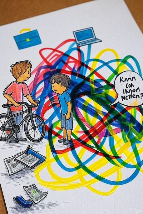 - "Wie... nicht angeschaut... Du musst doch wissen, wie der Zustand des Velos ist?! Wie willst du dem Kunden denn sagen, was es kosten wird, wenn du das nicht anschaust?" erwidere ich.